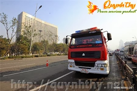 1 chiếc Xe cứu hỏa đứng chờ tại hiện trường vụ nổ. Ảnh: Xinhua